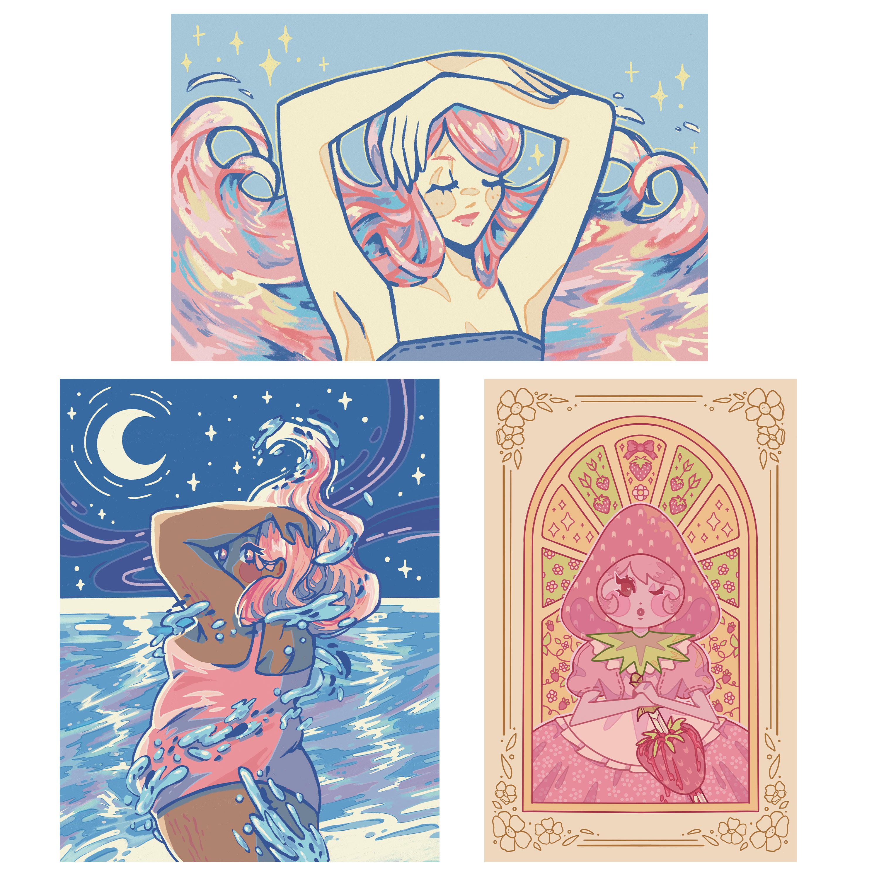 Whether you're drawn to strawberry-sweet magic, moonlit ocean waves, or peaceful coastal energy, these prints add personality, warmth, and color to any creative space.