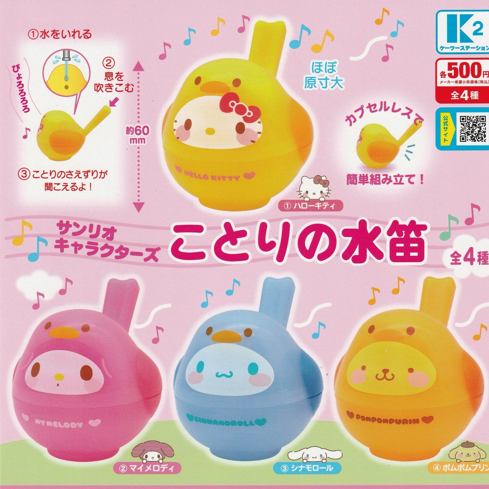 Make music with your favorite Sanrio friends! This cute gashapon series features Hello Kitty, My Melody, Cinnamoroll, and Pompompurin as colorful little bird-shaped whistles. Just add a bit of water, blow gently, and enjoy the cheerful chirping sound! Each capsule includes one random character — fun for both collectors and Sanrio fans alike.